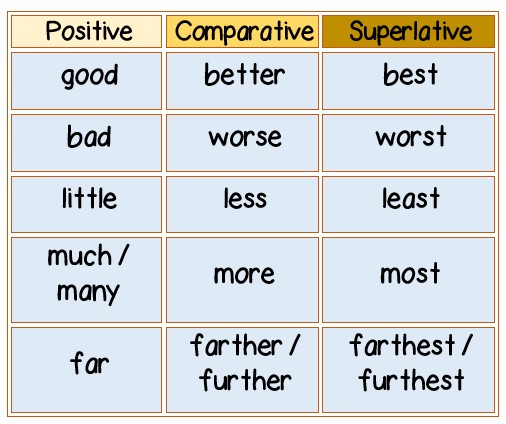 Example irregular adjectives: good, bad, far, little, much, many.