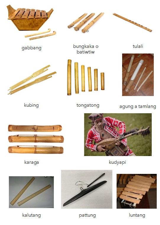 Notable instruments include the gabbang (bamboo xylophone), the kudyapi (wooden lute), and various bamboo stamping tubes like the Tongatong and Agung a tamlang. Wood was also used for clappers, log drums, and in the construction of artistic pieces such as ceremonial staffs and burial jars.