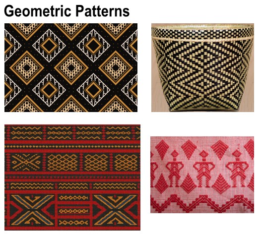 1. Geometric Patterns – Repeated lines, triangles, diamonds, and zigzags found in weaving (banig, t’nalak cloth).